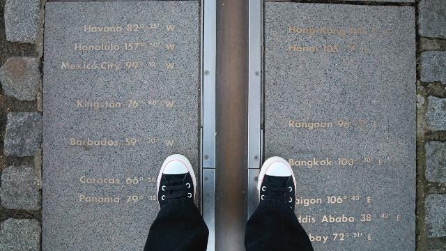 A mais famosa linha imaginária do mundo é o meridiano de Greenwich. Divide o mundo em dois. As pessoas gostam de ir até o Observatório Real, na Inglaterra, e tirar fotos com um pé em cada lado da linha: estão ao mesmo tempo nos dois hemisférios do mundo.